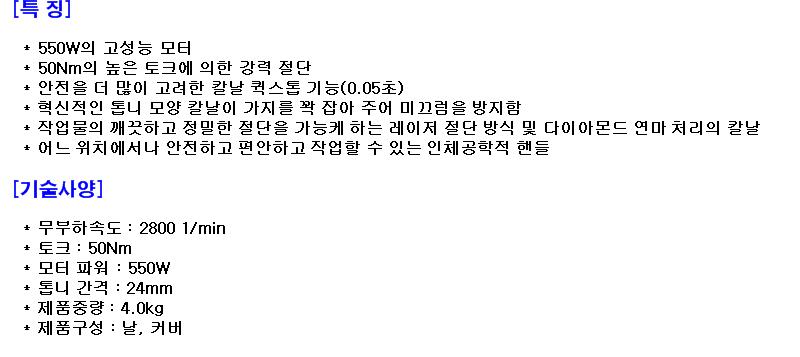 | 모델명 | 날길이(mm) | 소비전력(W) | 톱니간격(mm) | 중량(kg) | 출고단위 | 재고 (대구/서울/부산) | |